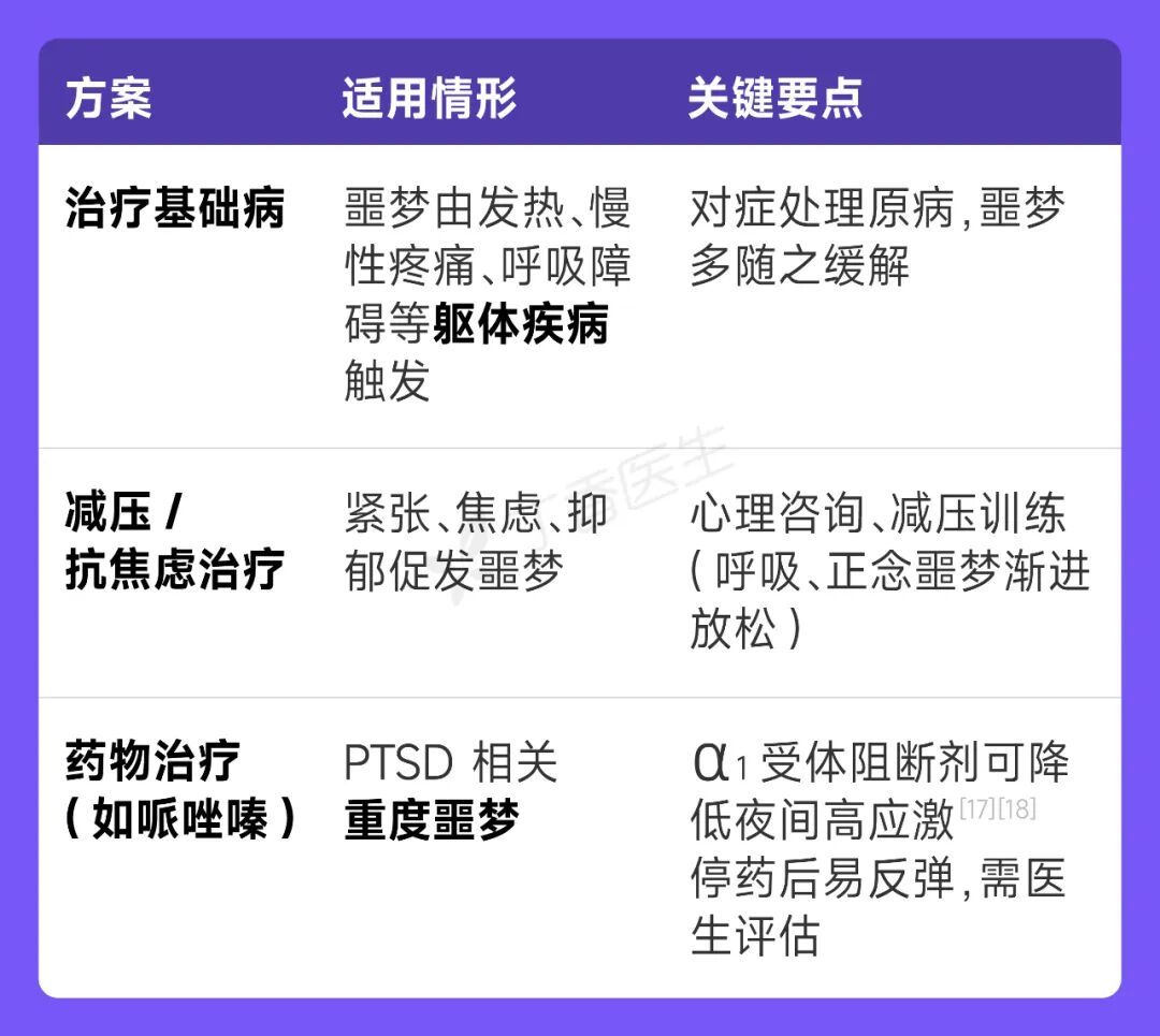 医生会帮助排除噩梦的诱因,通常采取「自上而下」的流程:先进行全面评估(睡眠结构、潜在创伤、精神疾病、用药等),如有必要再进入针对噩梦的专项治疗[18]。