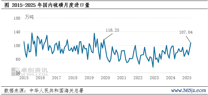 根据中华人民共和国海关总署公布的数据显示,2025年4月硫磺进口量107.04万吨,环比增加19.83%,同比增加74.82%,为2019年12月(116.25万吨)以来再次突破100万吨水平。由于4月进口增量明显,导致年内累计进口量同比由跌转涨:2025年1-3月累计进口硫磺248.69万吨,同比降低11.98%,而1-4月累计进口量达到355.73万吨,同比增长3.48%。
