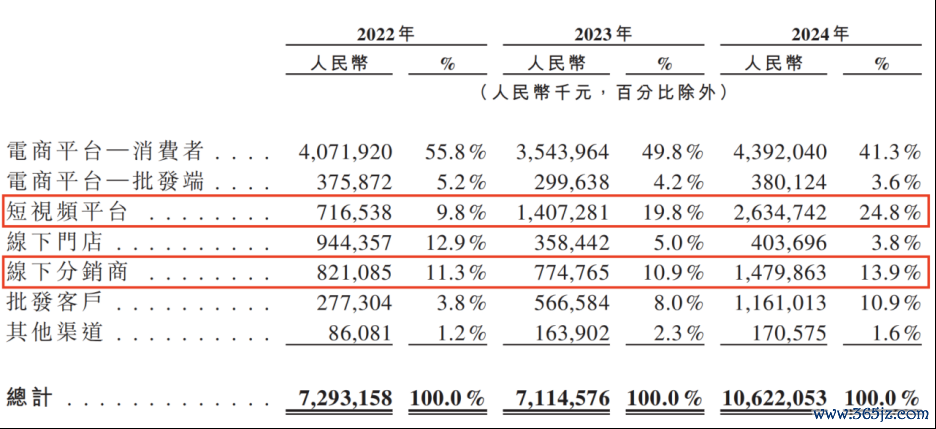 进入到2024年,三只松鼠在抖音上所取得的收入进一步提升,达到了21.88亿元,同比增长81.73%,首次超过天猫系的19.37亿元,成为最大线上渠道。从招股书中也可以看出,2022年-2024年,三只松鼠短视频平台销售收入分别约为7.17亿元、14.07亿元、26.35亿元;对应占公司营业收入比重分别为9.8%、19.8%、24.8%,占比接连增长。