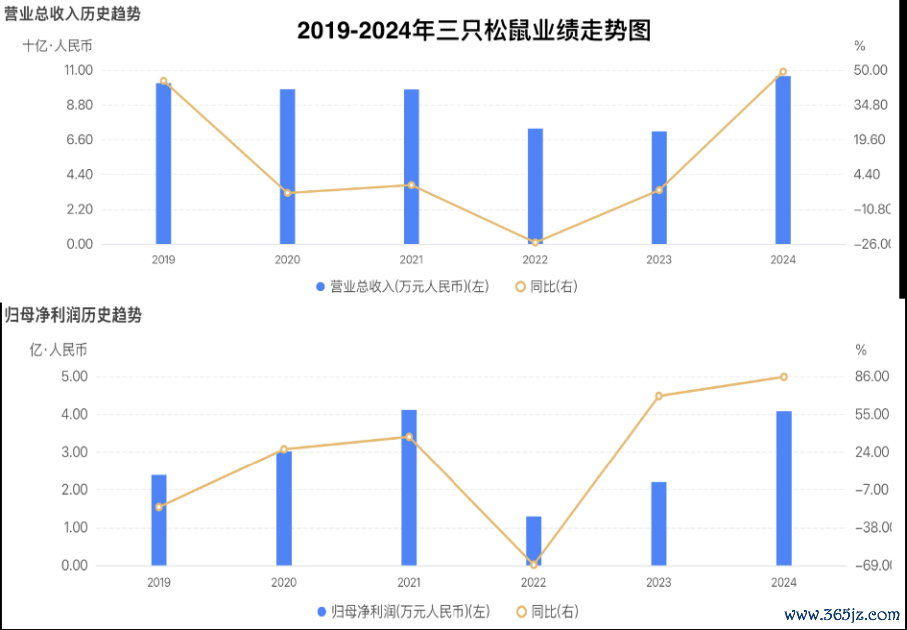 通过复盘三只松鼠业绩周期走势可见,2024年算是其增长动力的重要节点,成绩表现不俗。